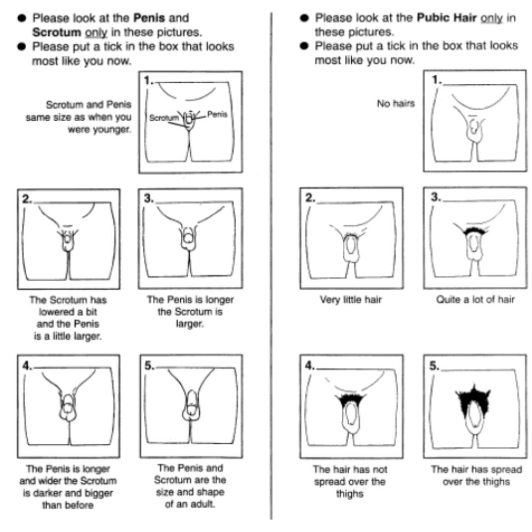 To support autonomy and privacy, we’ve also included visual self-assessment images on this page to help youth and families gauge development at home. These images are adapted from the Pubertal Development Scale and represent typical markers for each Tanner stage.