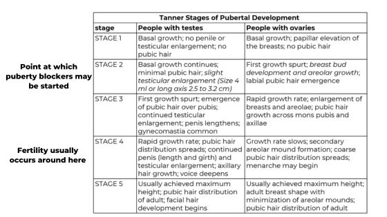 As you can tell from the chart at the top of this page, many physical changes occur between Tanner Stage 2 and Tanner Stage 4. This can be a big bummer for younger patients who want the option for biological kids in the future, but for whom later endogenous Tanner Stage attributes are unwanted. Each person and family has to find their own individual way through the challenges and limitations of our current gender affirming therapies and fertility preservation therapies.