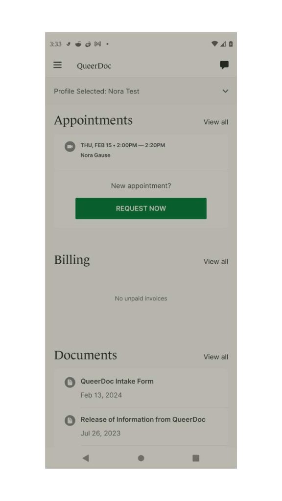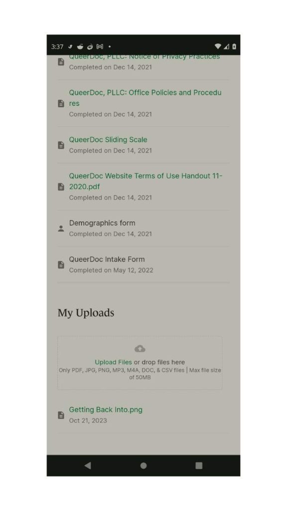 We use Simple Practice for our electronic medical chart and telehealth visit platform. You can use Simple Practice’s browser-based platform from your computer or on your phone, but there is also a phone app available. Simple Practice recently released a new app version with expanded capabilities.
